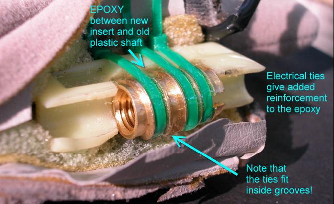 Before you glue everything in, you'll want to make sure that the shaft of the insert has the proper angle to what USED to be there in plastic form before it broke. So be sure to check the angles, and DON'T get any epoxy into the interior of the insert, or you'll wreck the threading area and the fit! Here's a shot of the angle that is critical: