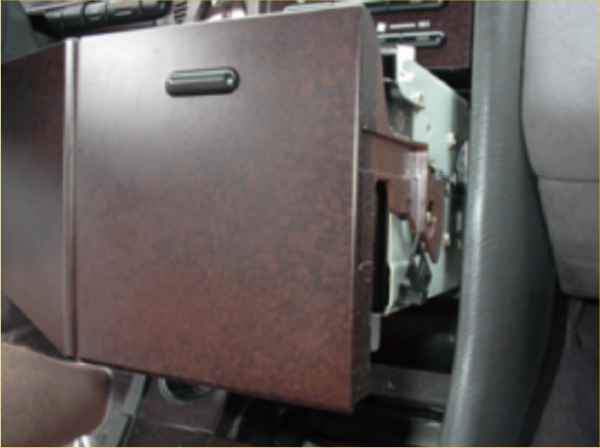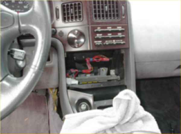 Once removed you'll see two screws at the top of the stereo housing. Remove these also. At this point you might want to remove the ashtray as this will make the rest of this install easier. Close the door that covers the stereo... this is important as it's attached to the physical stereo housing. Use the shift lock button to move the gear selector to "1" to get it out of the way of your work. Please a hand towel or something on top of the shift console to protect it from being scratched. Reach in through the hole opened up by the ashtray and gently pull the door toward you. When it moves slightly forward, reach back in through the ashtray hole and you should feel a metal lip pulled slightly away from a cross-bar that the stereo attaches to. You might want to use this to continue pulling the stereo out as it's sturdier than the plastic door! Cautionary note: the mechanism for the door has a tendency to catch a piece of the grey trim that folds around the main housing. You can use a plastic putty knife to push it out of the way if this occurs.