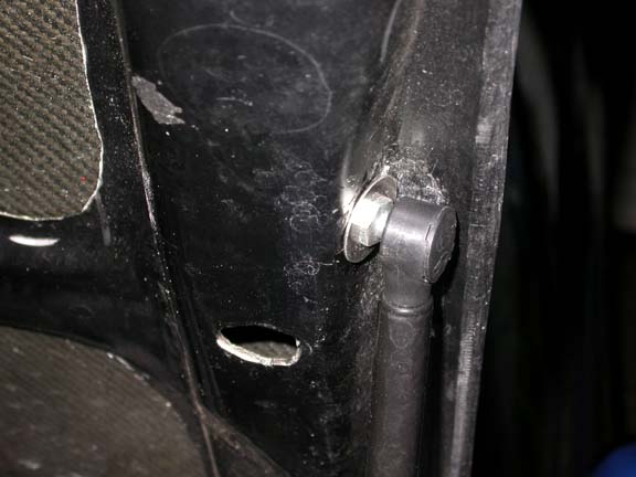 - Then drill an access hole in the under side of the hood near the hole for the ball stud. (This hole is to get a nut on the backside of the ball stud. I try gluing the ball studs into the hood and they only held for a couple of weeks)